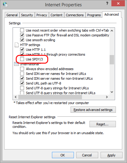 Izklopi se v Internetnih nastavitvah v IE, kjer se odstrani kljukica pri SPDY/3.