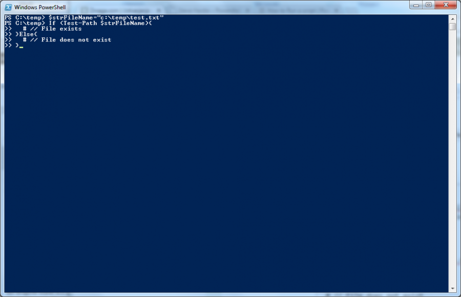 $strFileName="c:\temp\test.txt" If (Test-Path $strFileName){ # File exists }Else{ # File does not exist }