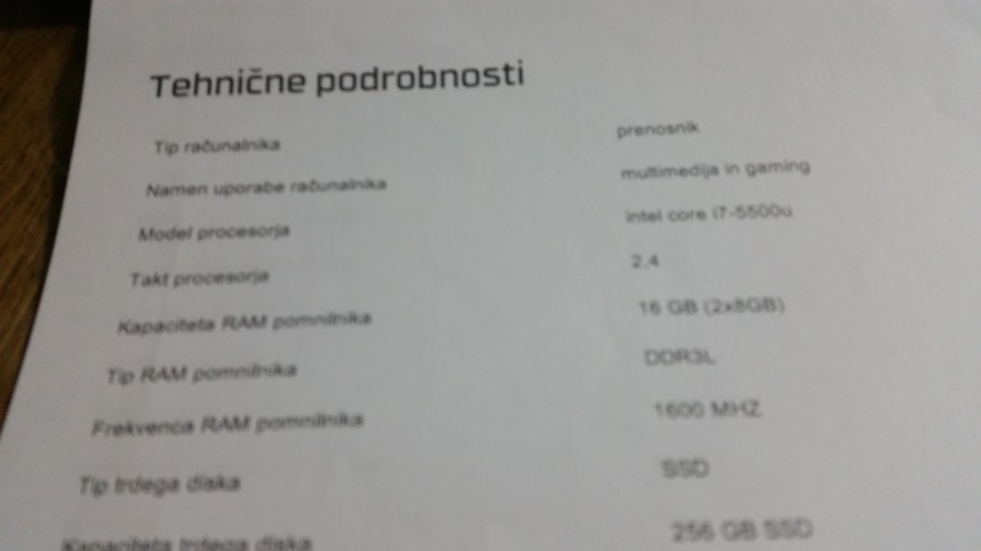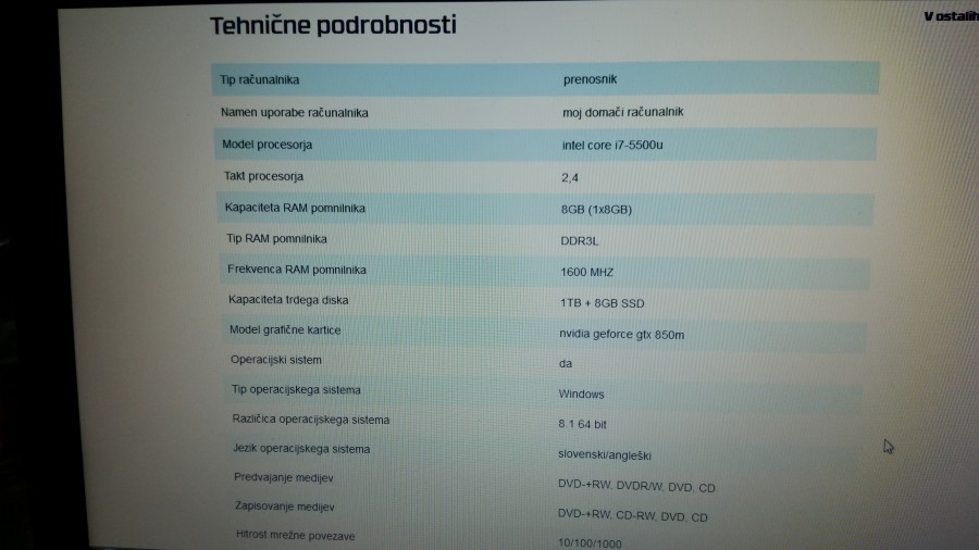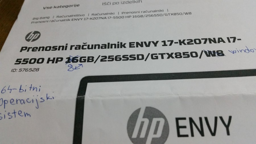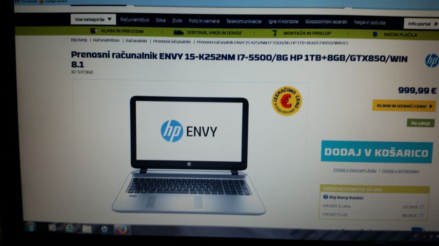 Hvala za odgovor in nasvet.Danes sem doživel veliko presenečenje v BIG BENGU Maribor.Odločim se za nakup HP ENVY i7/ 17/5500 HP 16GB/256SSD/GTX850/W 8,cena 1445€.Trgovec pove da imajo še dva na zalogi z 10% popust cena 1300€. Pomislim sreča,danes bo moj srečen dan.Do sedaj mi je sreča v življenju, večkrat obrnila hrbet. Tako je bilo tudi danes,saj mi trgovec pojasni da je odprodaja HP ENVY in da tega tipa nebodo več izdelovali.Garancija 1 leto. Kaj pa po poteku garancije bodo nadomestni deli,velik?.Kaj naredit naj računalnik razstavim in ga prodam po delih.Žalostno res nimam sreče. Saj so še drugi prenosniki,ampak navadil sem se na HP znamko.Drugi so še dražji in tudi cenejši HP-ji. Pred 4 leti sem kupil HP Pavilion dv7 ima 8GB/i7/W7/17 tudi v BIG BENGU Maribor.Do božiča bom upam našel HP prenosnik kateri bo finančno in po mojih željah ustrezen. Hvala.