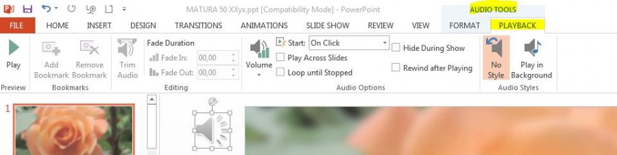 V Powerpoint-u je potrebno klikniti na novo dodano datoteko, tako da se zgoraj pojavi nov zavihek Zvok. Nato se v tem zavihku lahko nastavi največja velikost zvočne datoteke.