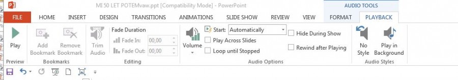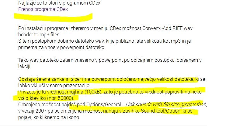 Hvala za trud, ampak vseeno nisem uspešna. Stvar na mojem računalniku seveda deluje, takoj ko pa predstavitev pošljem po e mailu drugemu uporabniku, GLASBE NI. Tudi opcije za povečanje glasbene datoteke v PPT 2013 nikjer ne najdem, pa naj klikam kakorkoli. In še: pri pretvorbi mp3 v wav se mi 2,67 MB velika datoteka mp3 spremeni v 15,2 MB veliko wav datoteko. ( za konvert sem uporabila program Audacity) Kup problemov, kajne, želja da bi bila uspešna z vašo pomočjo pa izjemno velika. Kdo ve, morda pa bom nekoč uspela. Z vašo pomočjo seveda. Zelo zelo si želim, da bi mi uspelo. P.S. Po dodatku glasbe se mi na izbrani datoteke prikaže *. Je prav tako ? Moram še kaj potrjevati ali je to to ?
