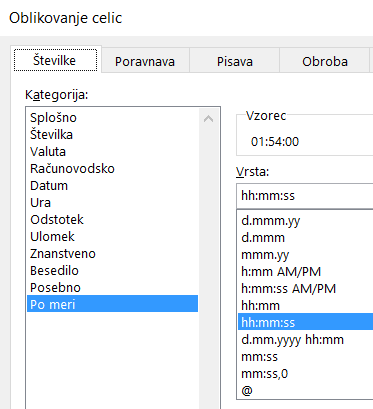 Izberi vse celice s podatki in pritisni desni klik ter izberi Oblikuj celice. Ko se ti odpre okno poglej, če je isto kot na spodnji sliki.