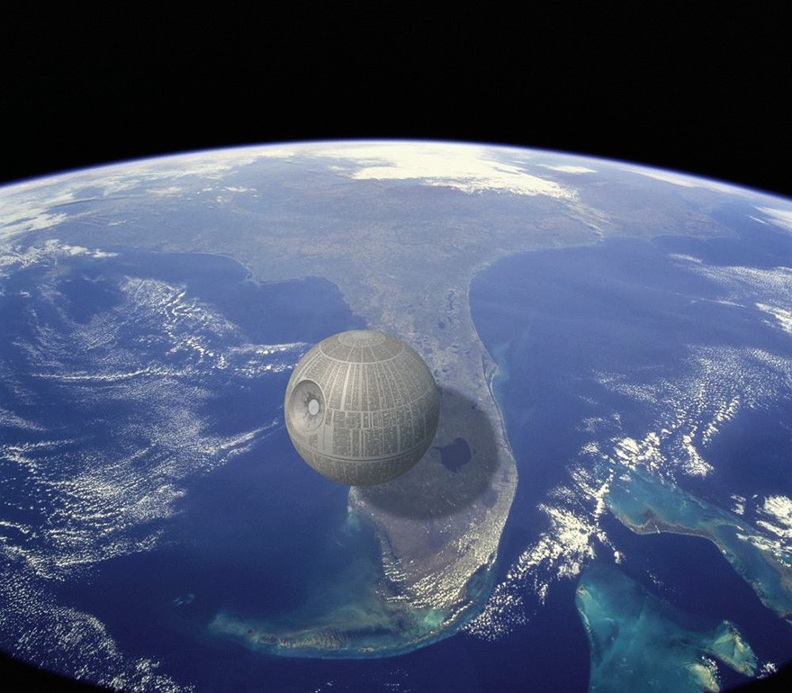 Zvezda smrti (Death Star) iz filmskega spektakla Vojn zvezd (Star Wars). Široka naj bi bila 160 kilometrov.