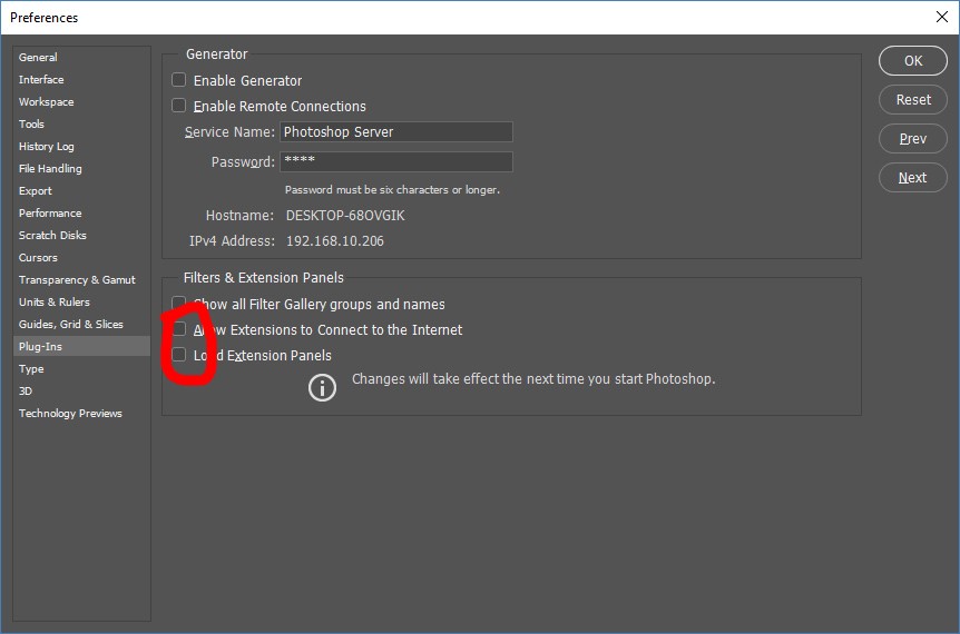 Potem pa odklukajte (ne sme biti označeno) "Allow extensions to connect to the internet" in "Load extension panels".