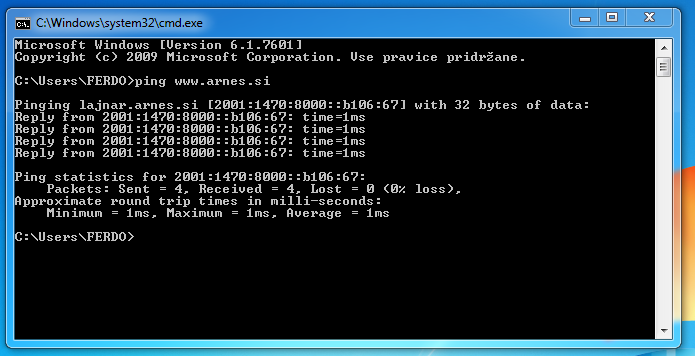 Drugač pa je odgovor na ping na arnes.si na sliki OK. Ali ti potem www.arnes.si ne odpre?