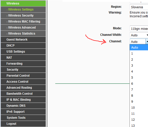 Aha, ali lahko probaš na nadzorni plošči routerja izbrati različne kanale (channel - kot je označeno na sliki) in za vsako izbiro shranit in preverit, če je hitrost boljša? Ali lahko še poveš kateri "Mode" imaš nastavljen (prav tako vidno na sliki, ki sem jo priložil)?
