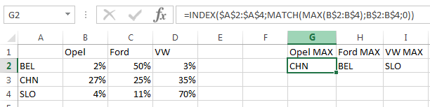 Želel bi formulo s katero bi iz stolpca OPEL izbral največji procent in bi mi pri tem v celico izpisalo državo torej CHNA, torej še za stolpec FORD je EST in za stolpec WV bi bilo FRA