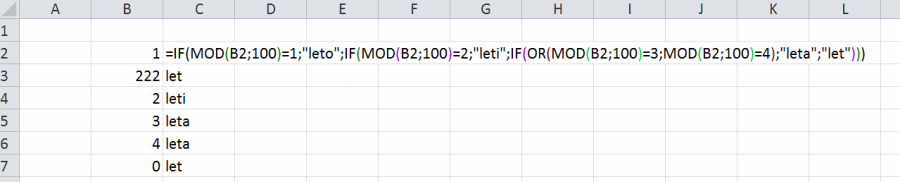 =IF(MOD(B2;100)=1;"leto";IF(MOD(B2;100)=2;"leti";IF(OR(MOD(B2;100)=3;MOD(B2;100)=4);"leta";"let" )))