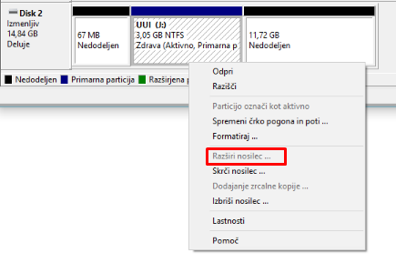 Poskusil sem tako, da sem formatiral primarno particijo ostale pa izbrisal vendar mi še vedno noče pokazati za razširitev nosilca.