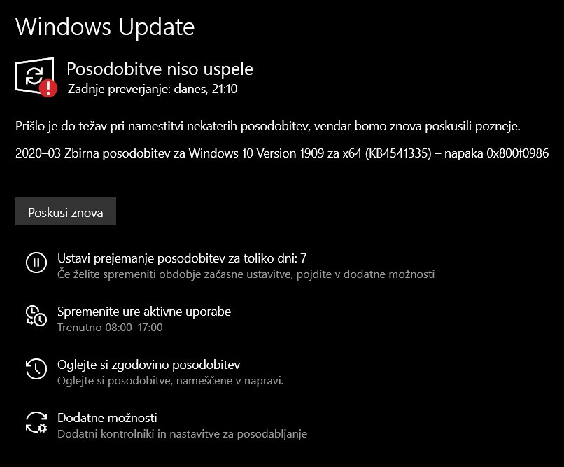 2020–03 Zbirna posodobitev za Windows 10 Version 1909 za x64 (KB4541335) – napaka 0x800f0986