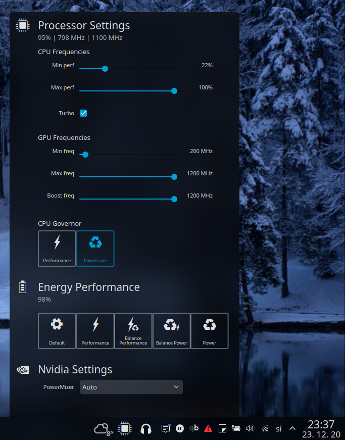 Našel sem en regulator med porabo energije in zmogljivostjo. Program je samo za KDE namizno okolje in eno pomembno opozorilo: programa ne uporabljajte, če imate nameščen Qt verzije 5.15.1. Posledica je nedelujoče namizje (vsaj v opisih).