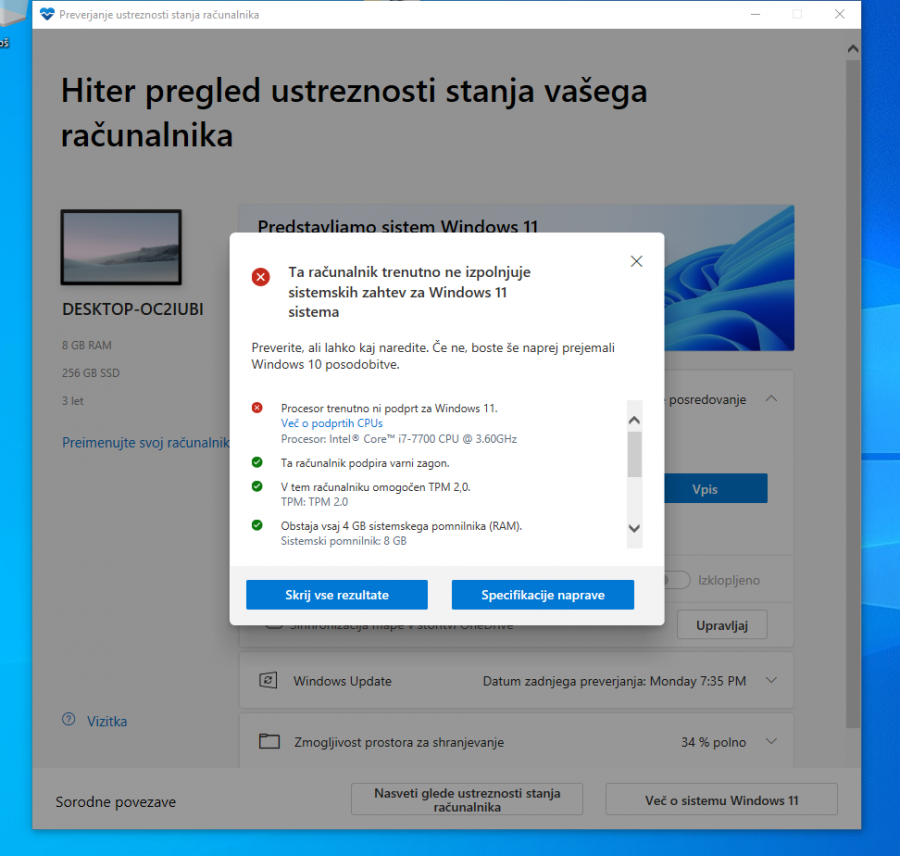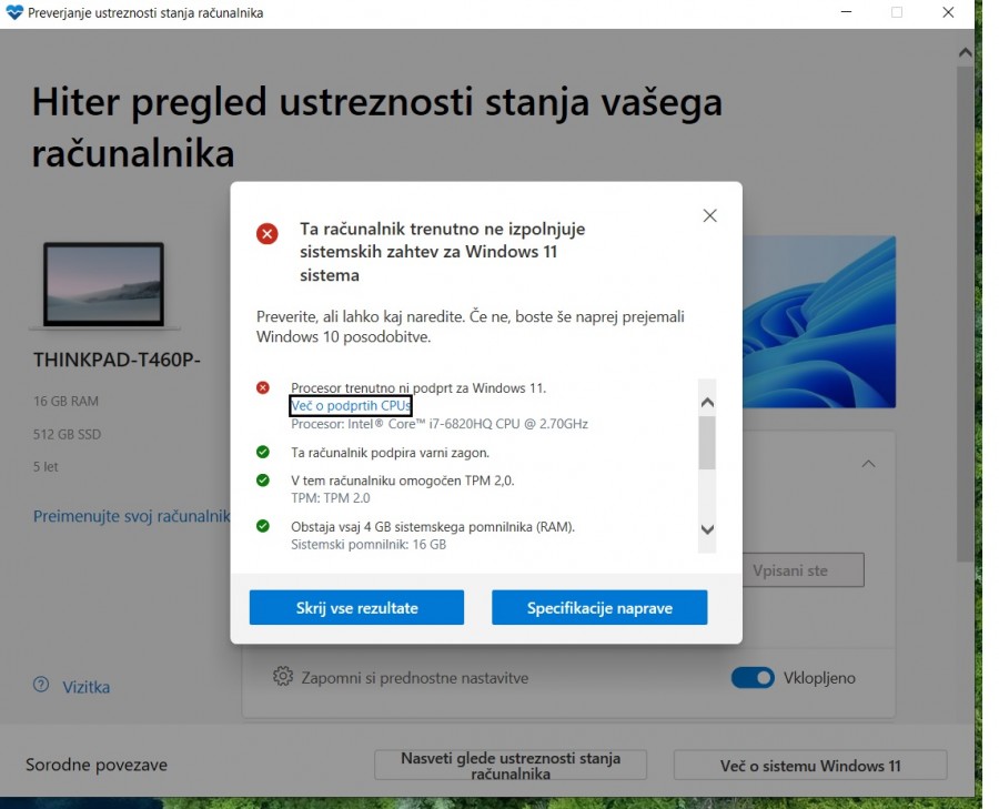 Ali procesor intel Core i7–7700 (Skylake, 3,2GHz Turbo način: 3,9 GHz, 14nm) res ne ustreza zahtevam za WINDOWS 11