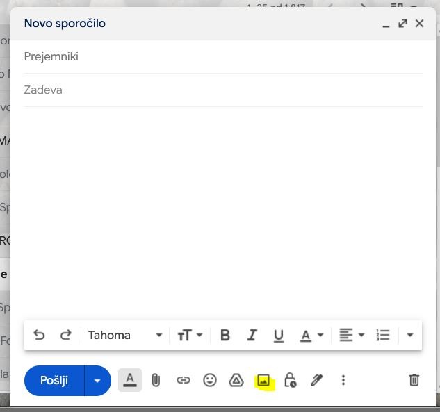 prosim za pomoč. Do nedavnega sem pri pisanju7 pošte v gmailu redno med tekst vnašala fotografije. Nenadoma pa mi je ta možnost zablokirana in nikakor ne znam vzpostaviti uporabnega stanja. Vesla bom, če mi lahko kdo pomaga in se mu že vnaprej lepo zahvaljujem.