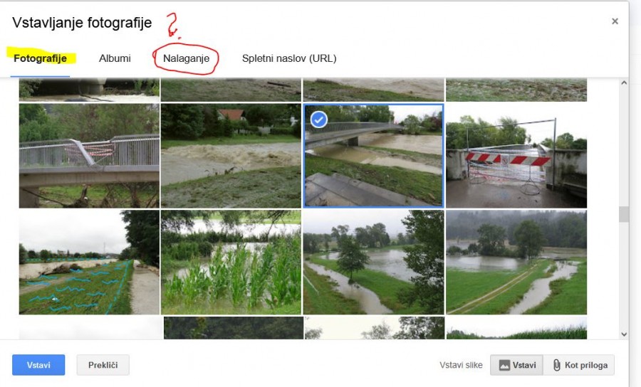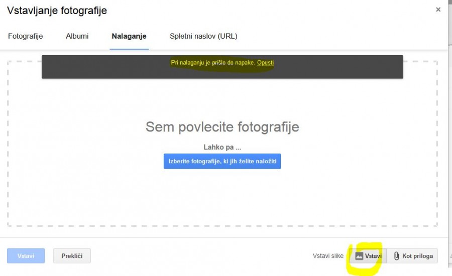 V čem je bil problem nemogočega nalaganja fotografij sem razkrila. Če uporabljam za vstop v Gmail brskalnik Firefox je nalaganje fotografij NEMOGOČE, če vstopam v Gmail z brskalnikom GOOGLE Chrome je postopek nalaganja fotografij mogoč. Gordijski vozel je presekan in vem nekaj več.