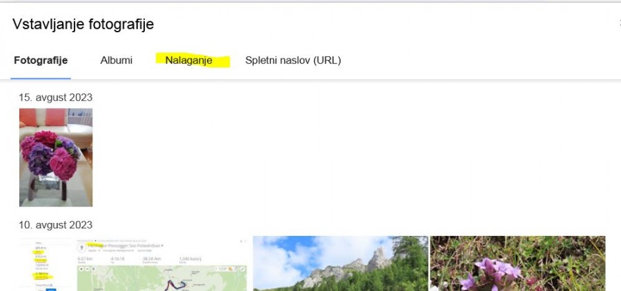 Samo še to, zdaj ugotovljeno. Fotografijo lahko vnesem, če jo imam v google photo, iz druge, svoje datoteke ne. Nalaganje fotografij pa nikakor ne gre.