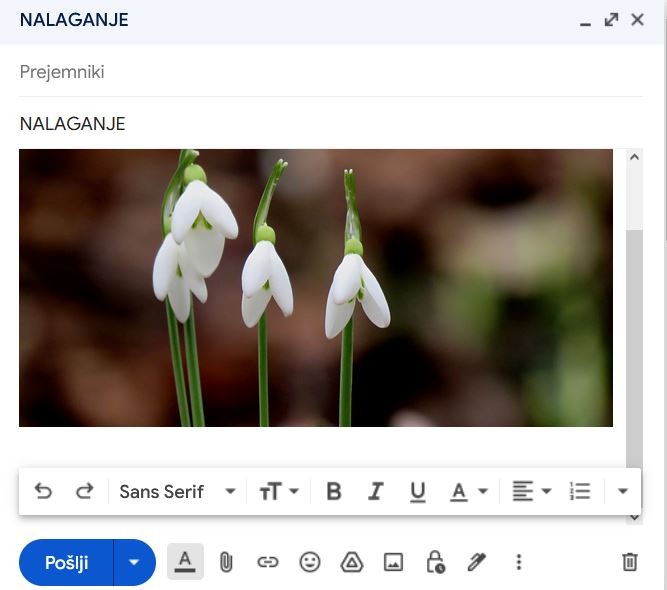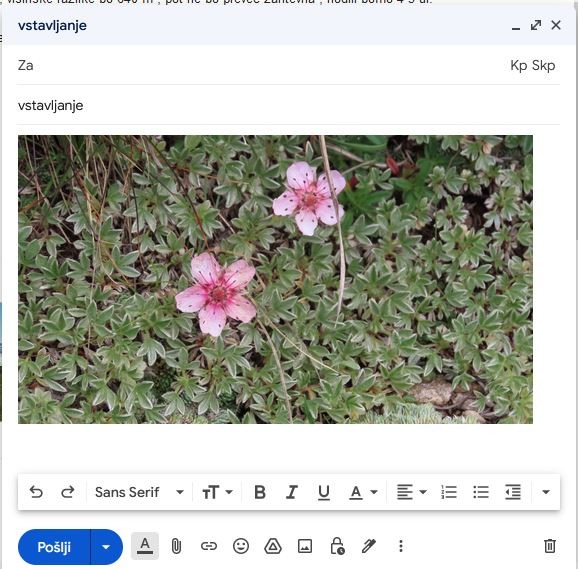Najlepša hvala za trud, ampak ne gre. Že sto in stokrat sem na ta način vnesla fotografijo med tekst ( jo izbrala iz svoje datoteke ) zdaj pa nalaganje ne gre in vztrajna objava PRI NALAGANJU JE PRIŠLO DO NAPAKE, OPUSTI. Seveda v gmailu fotografijo lahko dodam kot prilogo, ne morem pa je vnesti med tekst z opcijo vnesi fotografijo. Je mogoče možno to urediti s kakšnimi nastavitvami v Gmailu ? Sem pa poskusila fotko vnesti s copy in prilepi, pa dobi prejemnik namesto vnesene fotke na milijone črk. Ni da ni. Mogoče je narobe to, ker sem v google photo???. Se mi zdi, da sem prej kliknila ikono hribi(vstavi fotografijo ) in potem nalaganje in ni bilo vidnih nobenih fotk, sem šele začela z izbiro. Ne vem pa, kako bi prišla iz Google photo ?