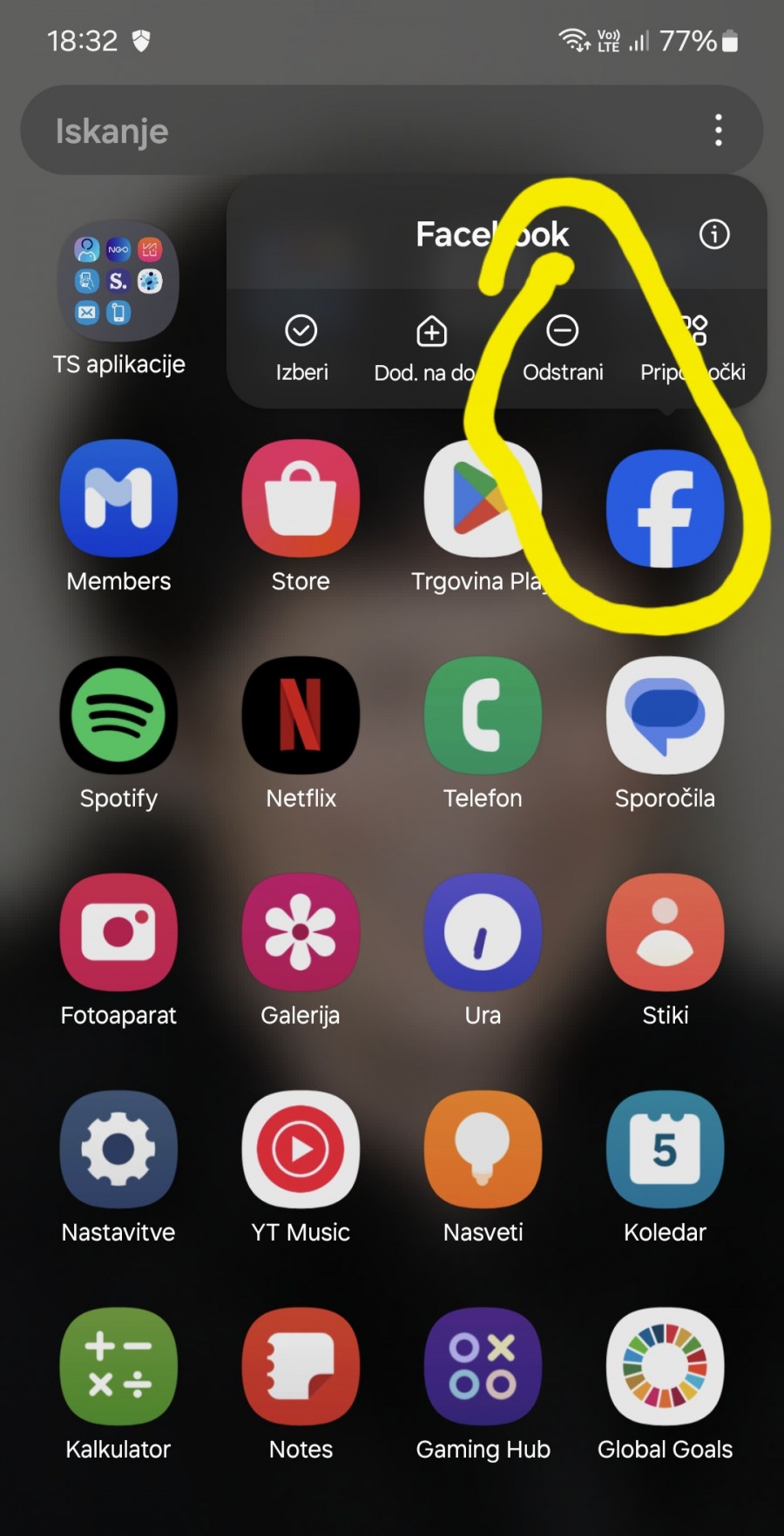Greš v nastavitve telefona, potem Aplikacije, se pomakneš na Facebook, klikneš gor, in dobiš možnost odstrani. Lahko pa tudi pritisneš ikono na telefonu, da se ti pokaže odstrani, klikneš odstrani in potrdiš odstranitev aplikacije facebook.
