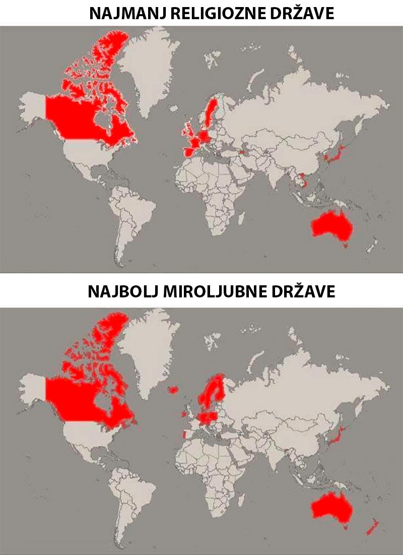 Najmanj religiozne (verske) in najbolj miroljubne države na svetu na zemljevidu.