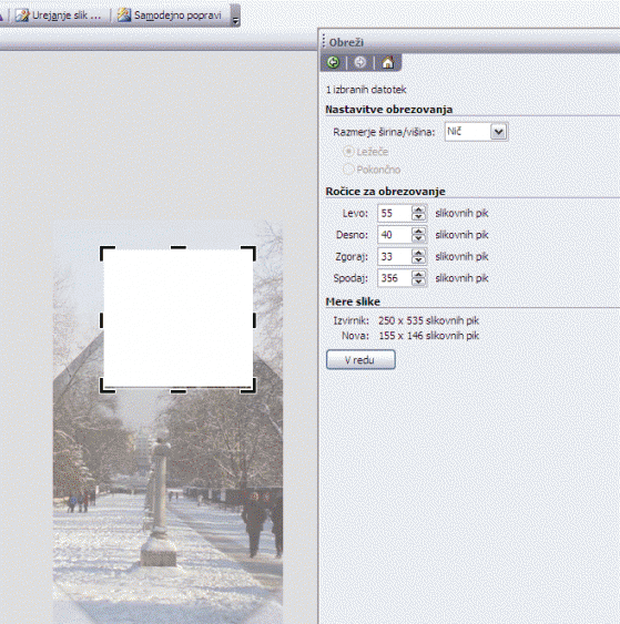 Tudi pri Crop tool bi moral imeti na vrhu nastavitev, kjer lahko nastaviš širino in dolžino (width in height).