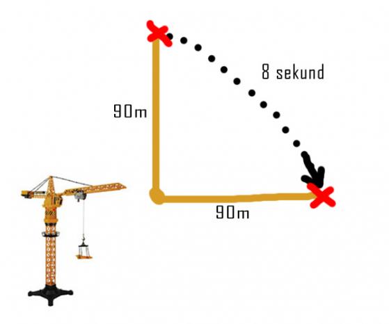 Gradbeni žerjav je dolg 90 metrov in potrebuje točno 8 sekund, da se obrne za 90 stopinj. Zanima me, kolikšna je hitrost zadnjega dela žerjava (nosu) v kilometrih na uro?