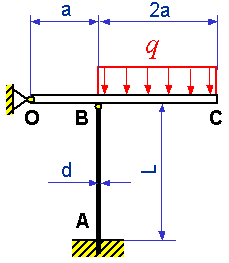 Členkasto pritrjeni tog nosilec OBC, ki je obremenjen z zvezno porazdeljeno obtežbo q, je preko zgloba B povezan s palico (E=210 GPa) krožnega preseka AB.