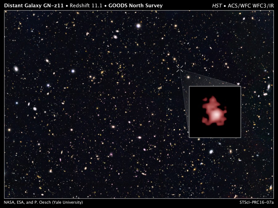 Vesoljski teleskop Hubble je znova podrl rekord. Posnel je najbolj oddaljeno (znano) galaksijo, ki izhaja iz prve generacije zvezd in galaksij sploh. Svetloba je do nas potovala kar 13,4 milijarde let.