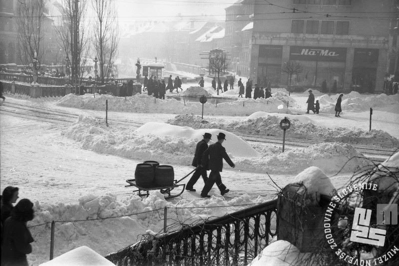 Prešernov trg v zasneženem jutru. Ljubljana, 10. Februar 1947, foto: Marjan Pfeifer. Fotografijo hrani Muzej novejše zgodovine Slovenije v zbirki Foto Slovenija.