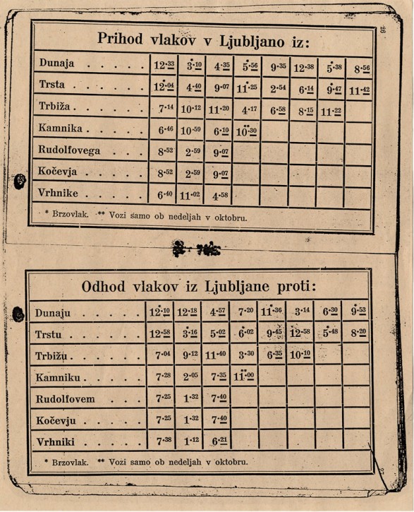 Naslovnica voznega reda (1. oktobra 1910) s prihodi in odhodi vlakov v Ljubljano in iz nje.