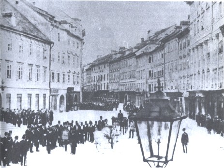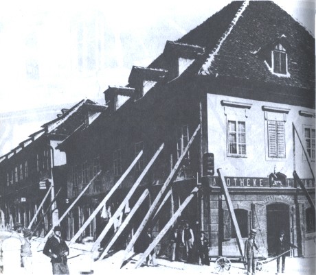 Lekarna in hiša W. Mayerja na Marijinem (danes Prešernovem) trgu po potresu.