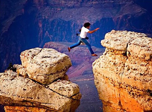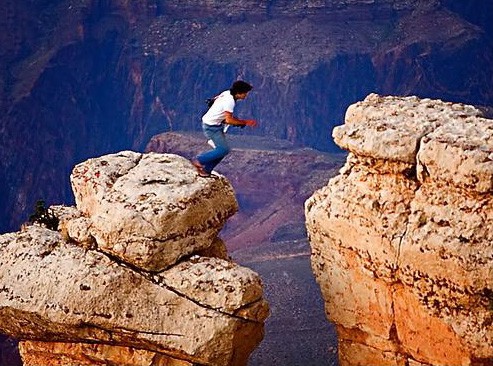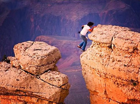 Bil sem preprosto šokiran, ko sem zagledal tega možakarja, ki je stal na tej osamljeni skali nad Grand Canyon-om. Globina kanjona na tem mestu je 900 metrov. Skala na njegovi desni je na robu kanjona in je varna.